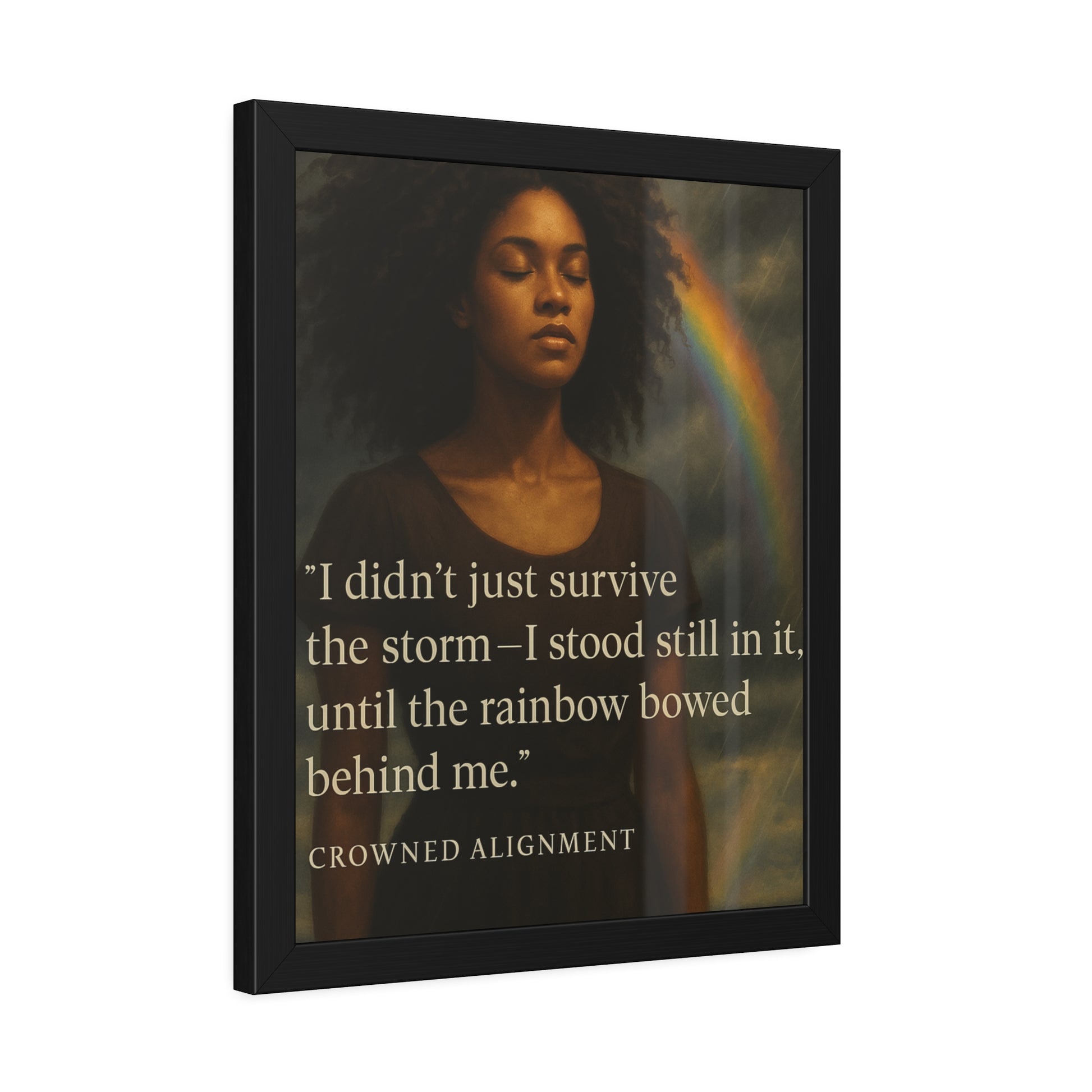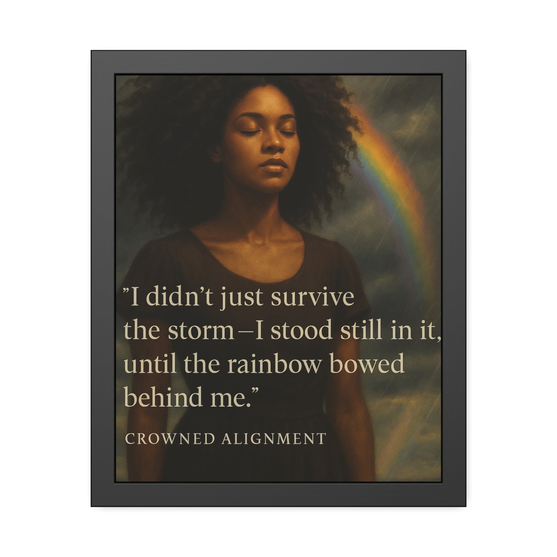 This framed quote print from Crowned Alignment features the message: "I didn't just survive the storm- I stood still in it, until the rainbow bowed behind me."